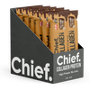 Take your taste buds on a wild ride, the ultimate fusion of indulgence and nutrition, with our new chocolate covered Collagen Protein Bars. Beneath the heavenly dark chocolate lies a delectable core of biscuity, Peanut Butter. But this bar is more than just an enticing delight for your taste buds. It's still a powerhouse of protein, healthy fats and fibre, meticulously crafted to fuel your #ChiefLife and vanquish your hunger.