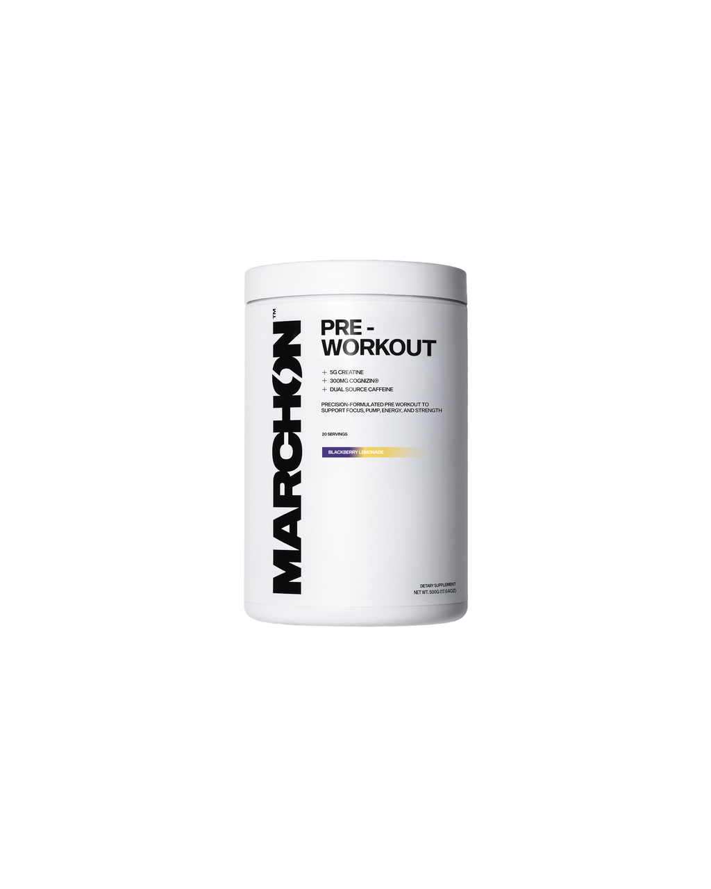 The MARCHON pre workout is a potent blend crafted to elevate your training performance, amplify blood flow for intense muscle pumps and supercharge your focus. This advanced pre-workout formula is packed with research backed ingredients in effective doses that will take your gym session to the next level.